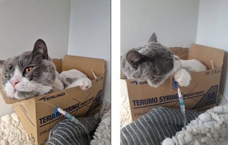 After a long stay, Harley was finally well enough to return home, and was reunited with his feline friend Rocco. The first week back home was challenging, as Harley was quiet and not eating much, but with the care of his family, support from his primary care vets, and ongoing advice from our team – including our amazing feline medicine clinician, Sam Taylor, he steadily improved.